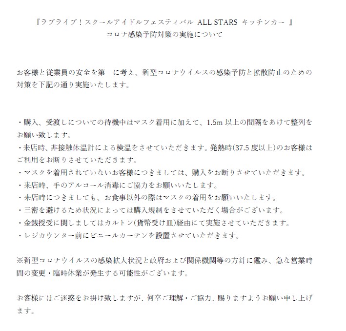 「ラブライブ!スクールアイドルフェスティバル ALL STARS キッチンカー at ODAIBAデックス東京ビーチ」よりメニュー変更のお知らせ