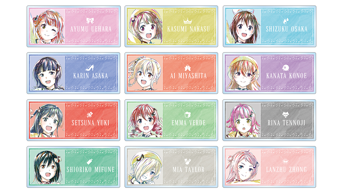 上原 歩夢、中須 かすみ、桜坂 しずく、朝香 果林、宮下 愛、近江 彼方、優木 せつ菜、エマ・ヴェルデ、天王寺 璃奈、三船 栞子、ミア・テイラー、鐘 嵐珠を新たなタッチで魅力的に表現し、アクリルネームプレートに仕上げました。