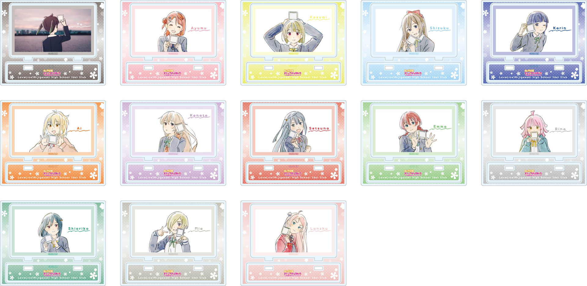 種類 :全12種(上原 歩夢、中須 かすみ、桜坂 しずく、朝香 果林、宮下 愛、近江 彼方、優木 せつ菜、エマ・ヴェルデ、天王寺 璃奈、三船 栞子、ミア・テイラー、鐘 嵐珠)