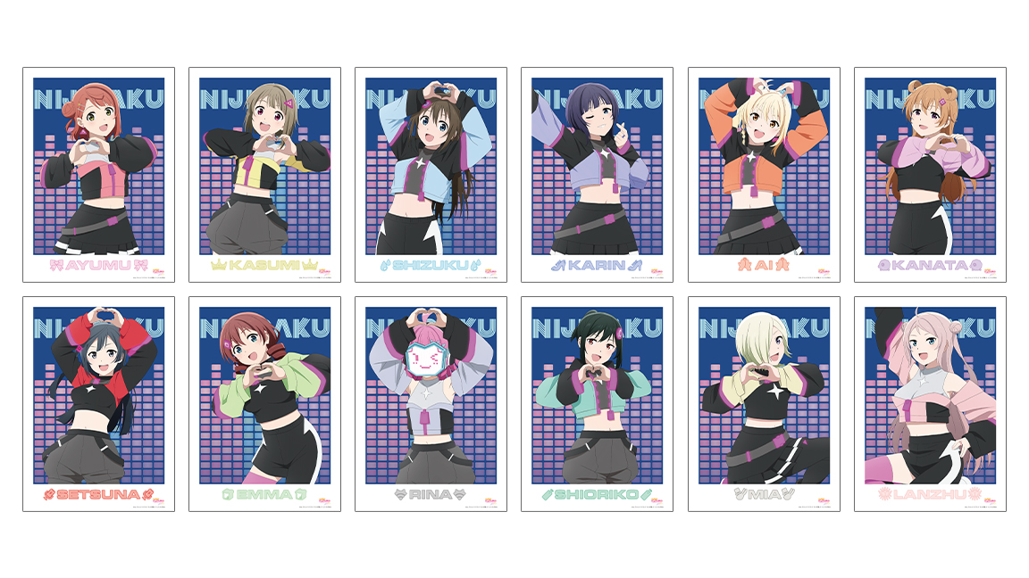 種類 :全12種(上原 歩夢、中須 かすみ、桜坂 しずく、朝香 果林、宮下 愛、近江 彼方、優木 せつ菜、エマ・ヴェルデ、天王寺 璃奈、三船 栞子、ミア・テイラー、鐘 嵐珠)